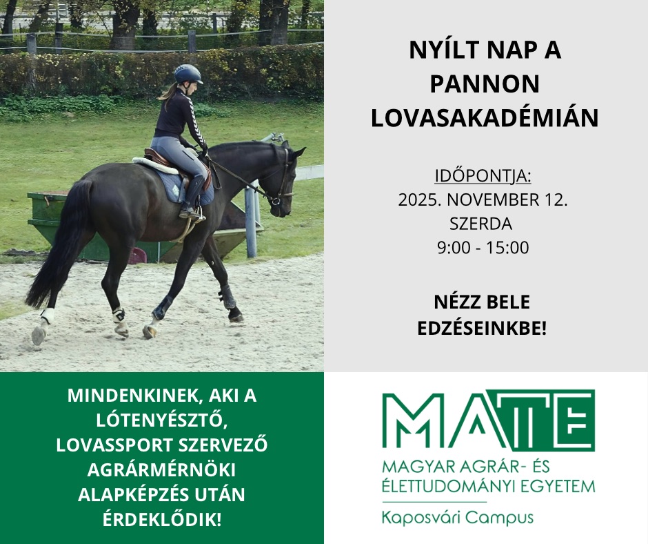 A MATE Pannon Lovasakadémia nyílt napot tart a Lótenyésztő, Lovassport szervező agrármérnöki alapképzés után érdeklődőknek. Ezúttal nemcsak elméletben beszélünk arról, hogyan zajlanak nálunk az edzések, hanem minden évfolyam edzése szabadon megtekinthető is!